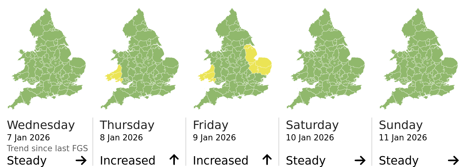 This shows the latest issued Flood Guidance Statement. This is taken from the Environment Agency real-time flood monitoring API, shortly after it is issued by the Flood Forecasting Centre. The highest overall risk is shown, as well as the highest forecast flood impact. This website is not operationally supported. Supported sign up and delivery of the FGS is here.