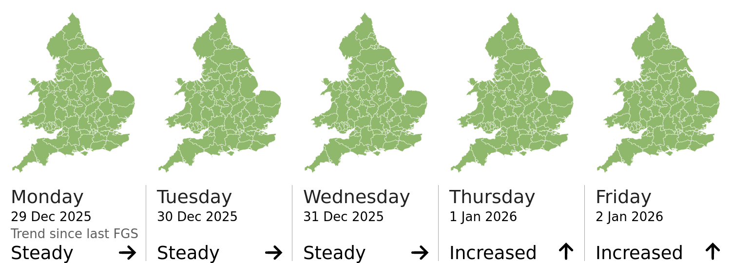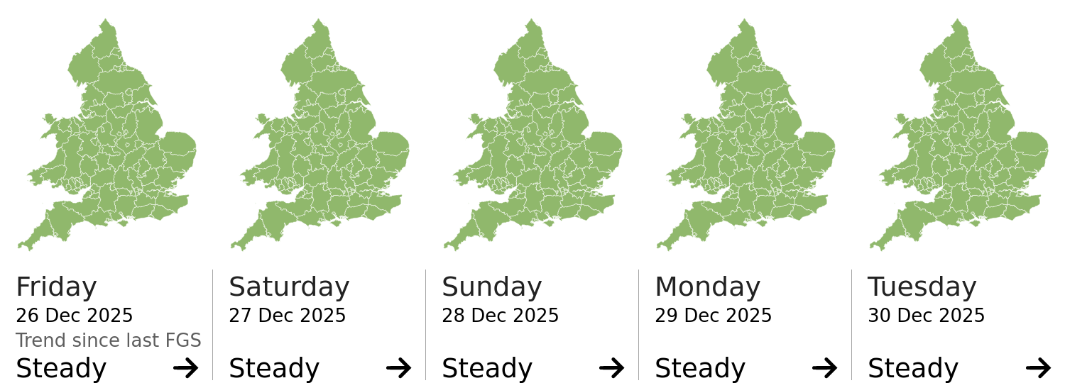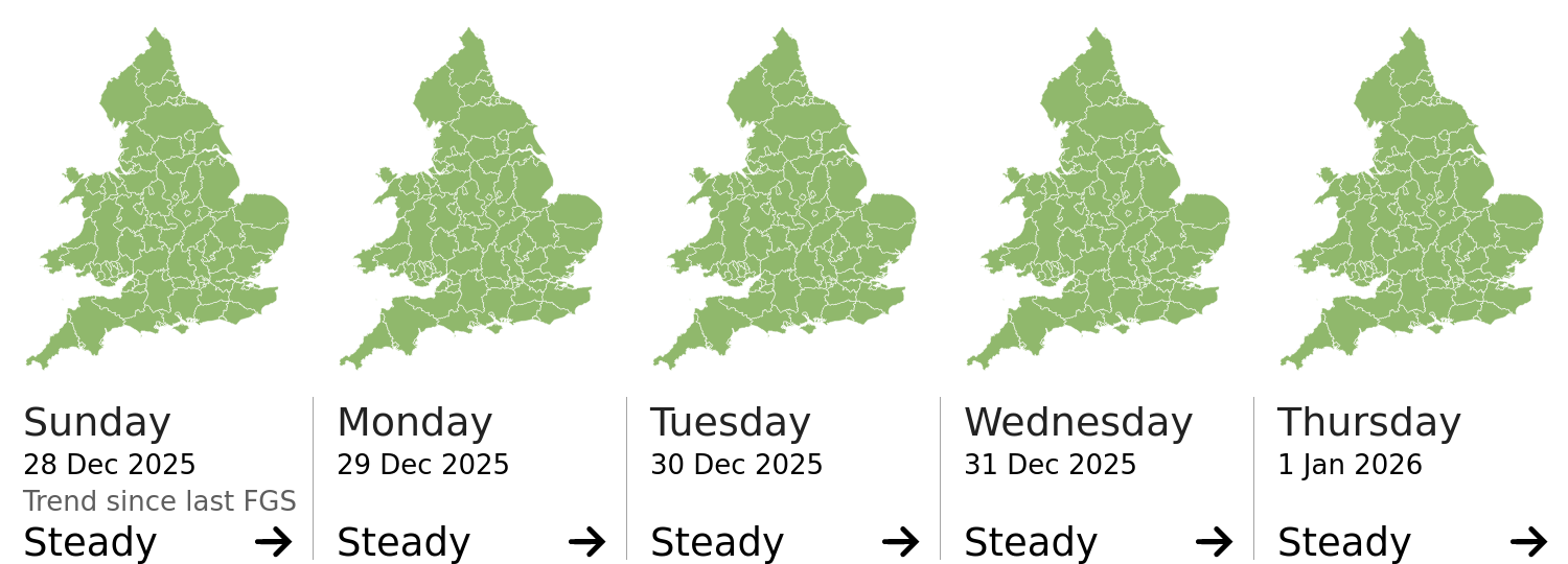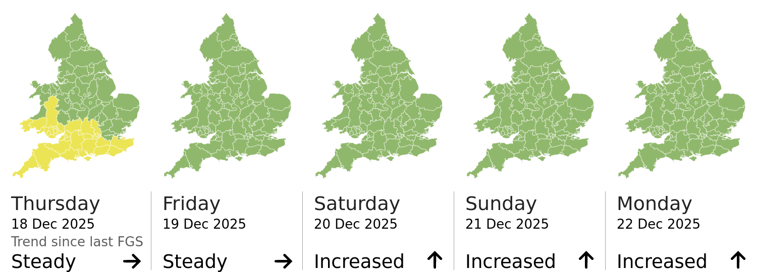 | Coastal | The coastal/tidal flood risk is VERY LOW for the next five days. Minor coastal flooding impacts are possible but not expected on Thursday and Friday around some coasts of England. |
