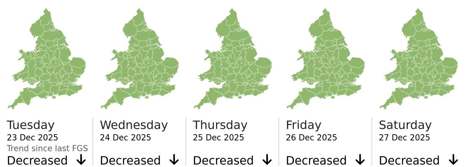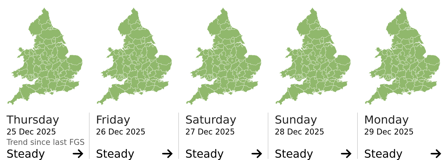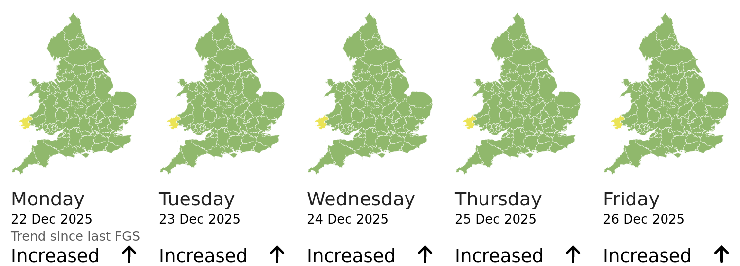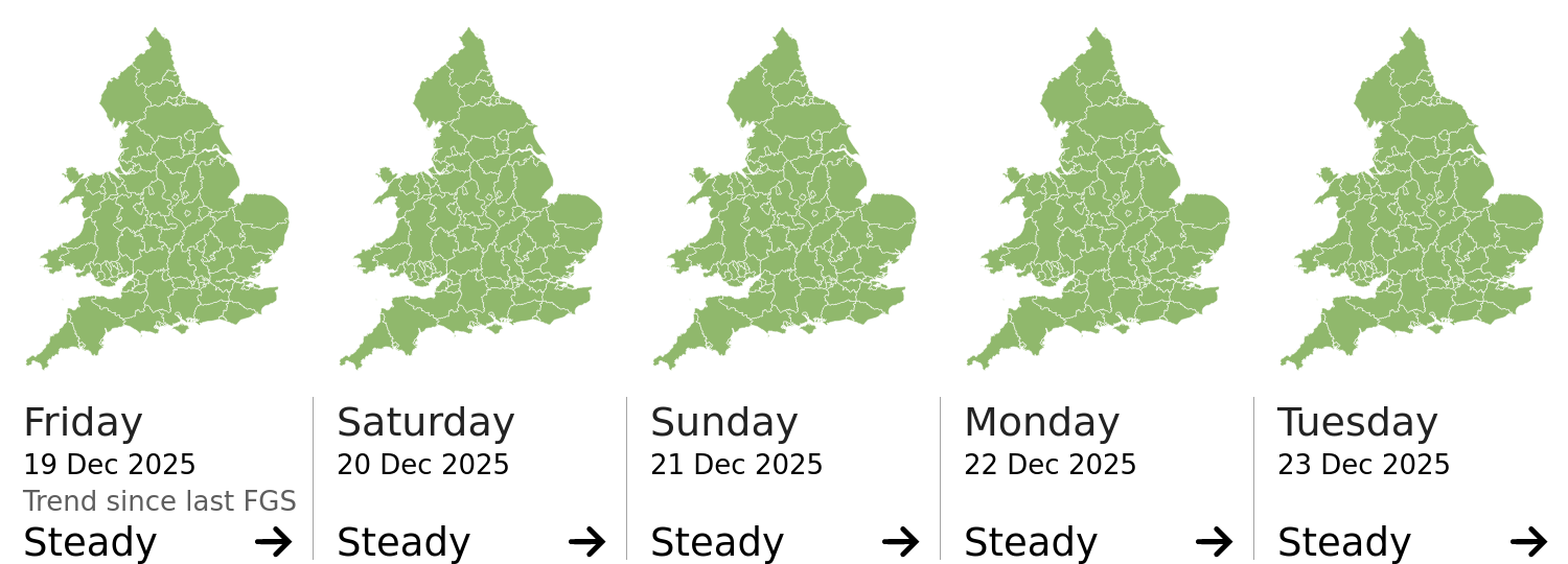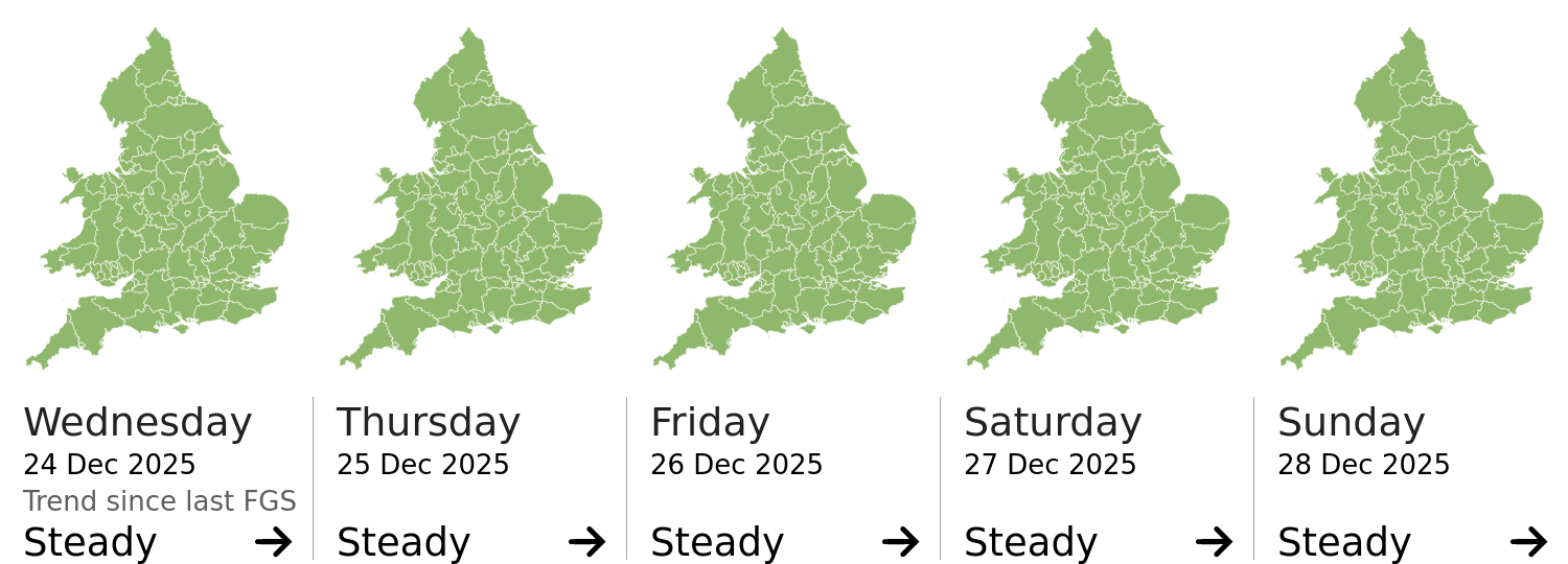 | Coastal | The coastal/tidal flood risk is VERY LOW for the next five days. Minor coastal flooding impacts are possible but not expected on Thursday and Friday around some coasts of England. |