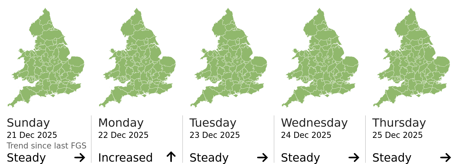 This shows the latest issued Flood Guidance Statement. This is taken from the Environment Agency real-time flood monitoring API, shortly after it is issued by the Flood Forecasting Centre. The highest overall risk is shown, as well as the highest forecast flood impact. This website is not operationally supported. Supported sign up and delivery of the FGS is here.