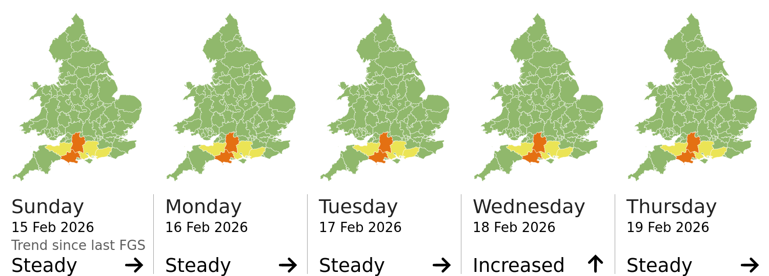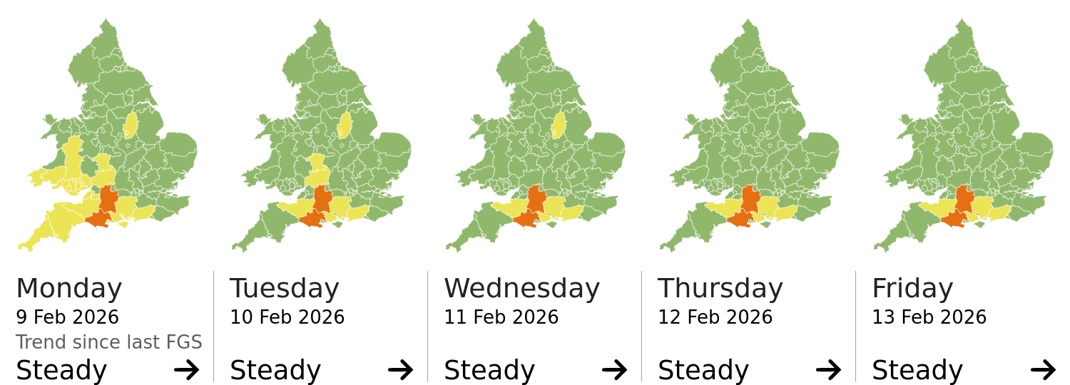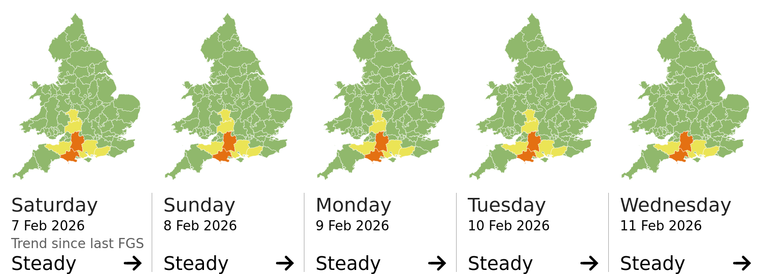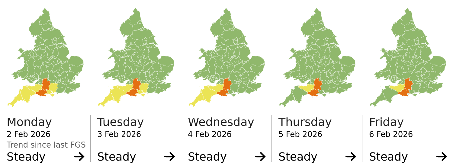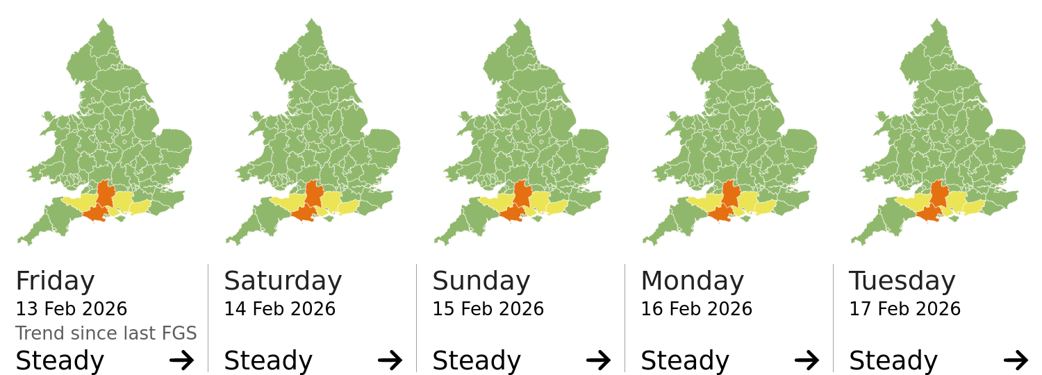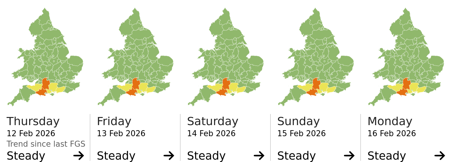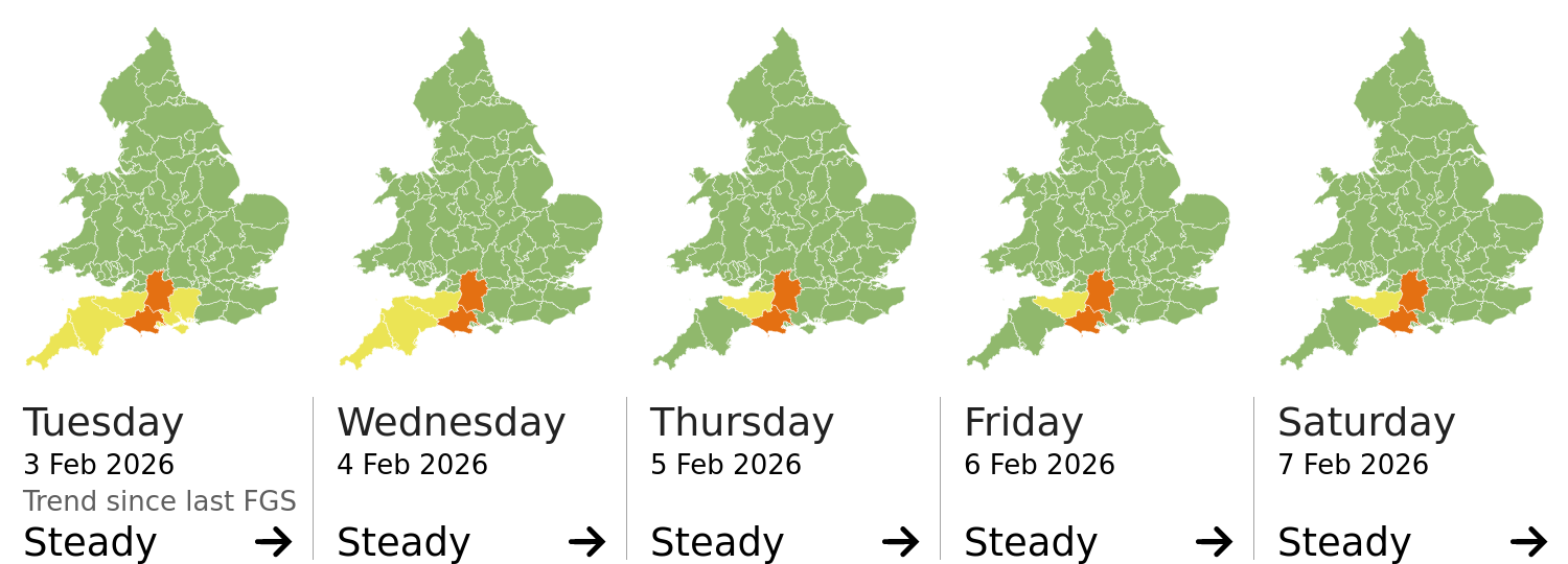 | Groundwater | The groundwater flood risk is MEDIUM for the next five days. Significant groundwater flooding impacts are probable in parts of Dorset and Wiltshire, with minor impacts probable for parts of Hampshire and West Sussex for the next five days. Minor groundwater flooding impacts are also possible in Kent and East Sussex due to steadily rising levels. See Specific Areas of Concern Maps. |
