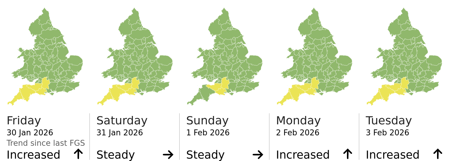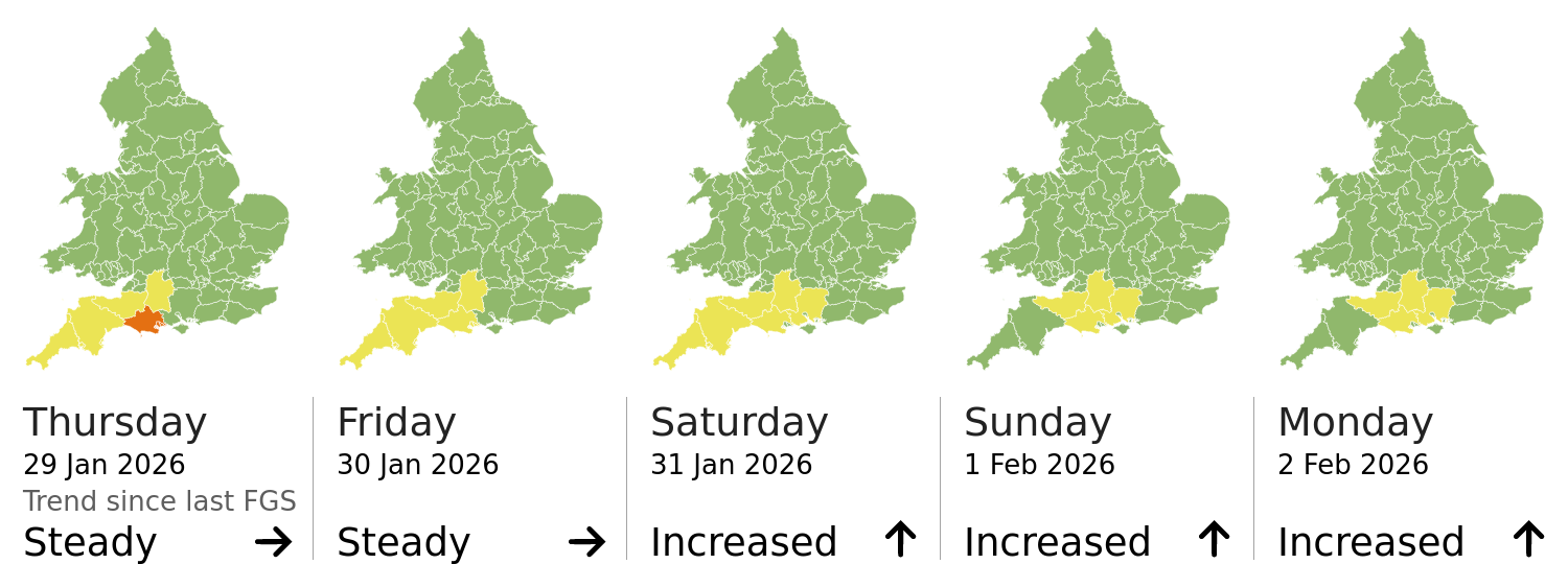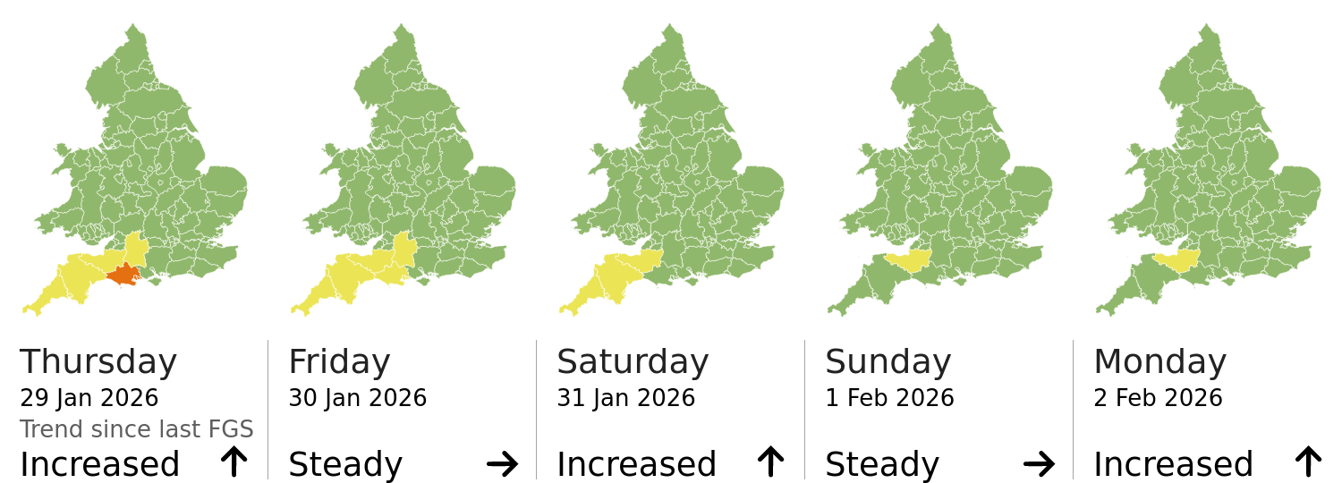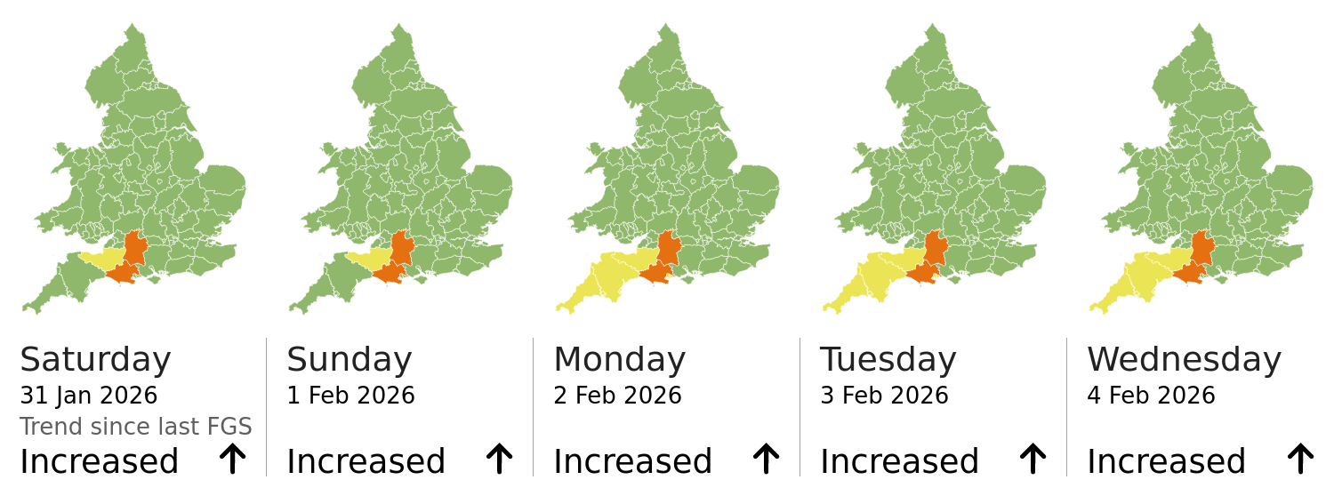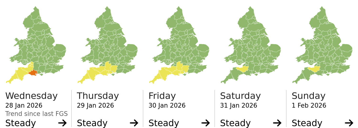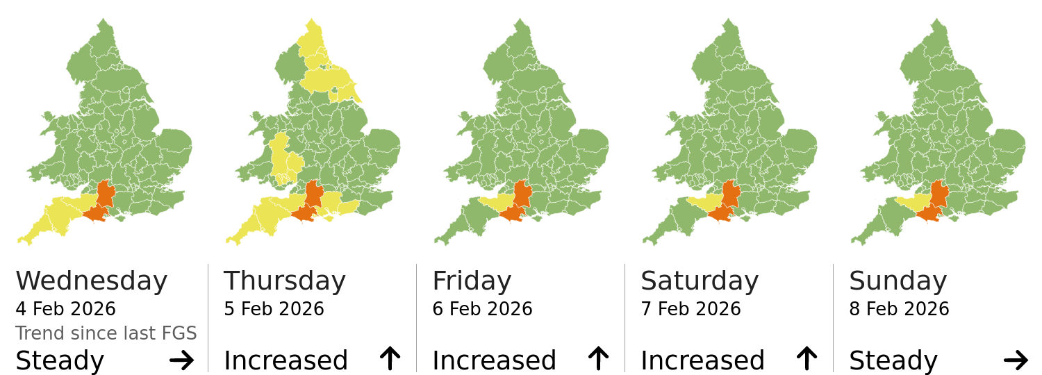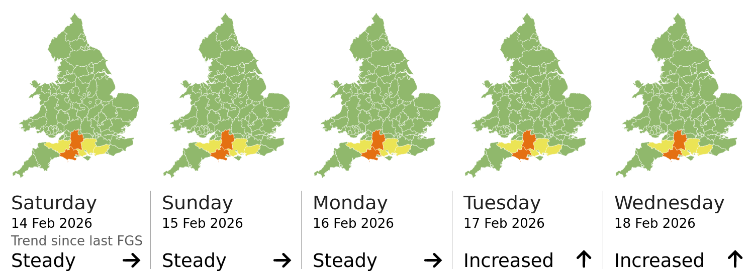 | Groundwater | The groundwater flood risk is MEDIUM for the next five days. Significant groundwater flooding impacts are probable in parts of Dorset and Wiltshire, with minor impacts probable for parts of Hampshire and West Sussex for the next five days. Minor groundwater flooding impacts are also possible in Kent and East Sussex due to steadily rising levels. See Specific Areas of Concern Maps. |