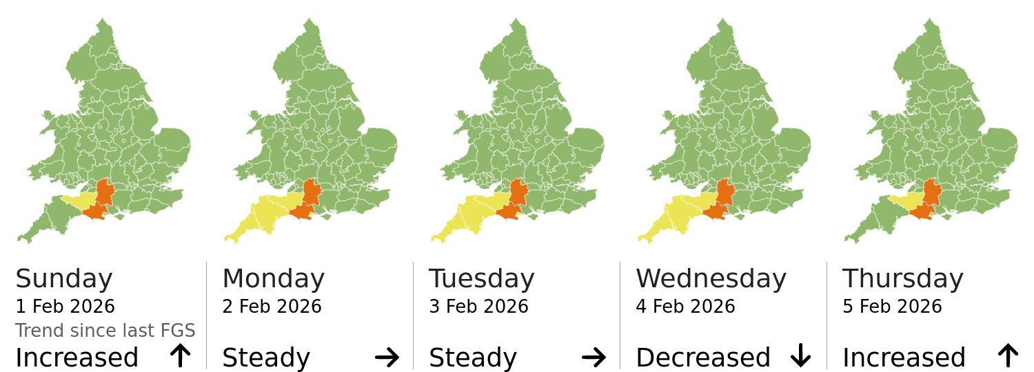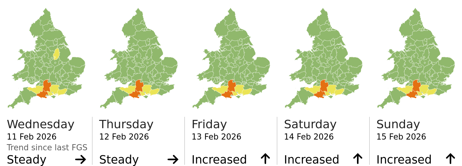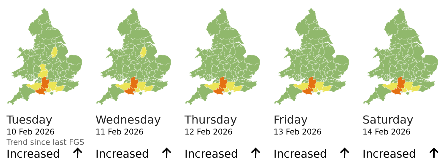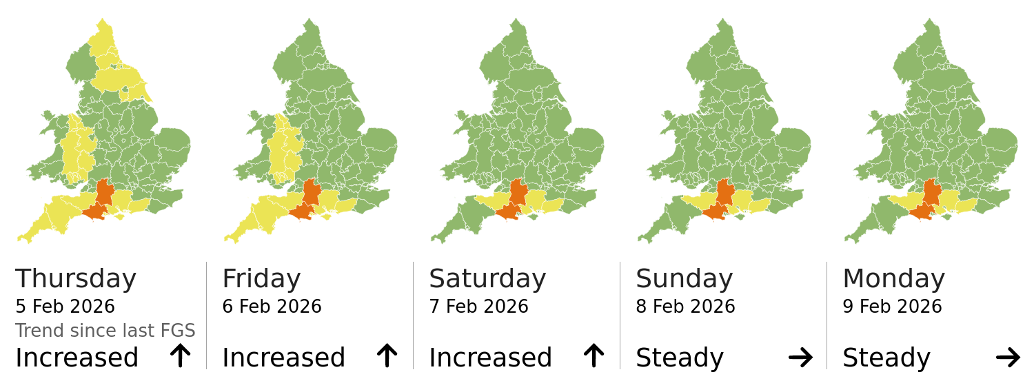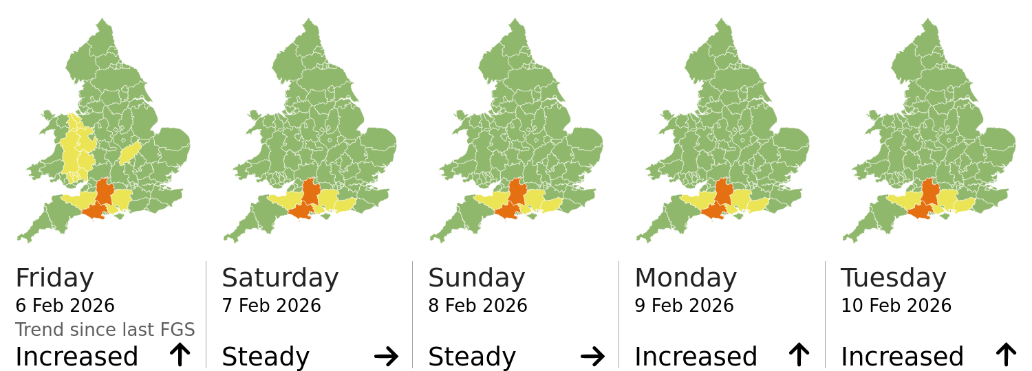 | Headline | Significant groundwater flooding impacts are probable in Dorset and Wiltshire and significant river flooding impacts are possible in Somerset during the next five days. The overall flood risk is MEDIUM. See 6-10 day section. | |||