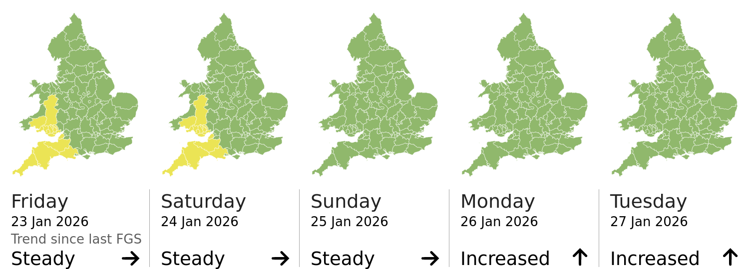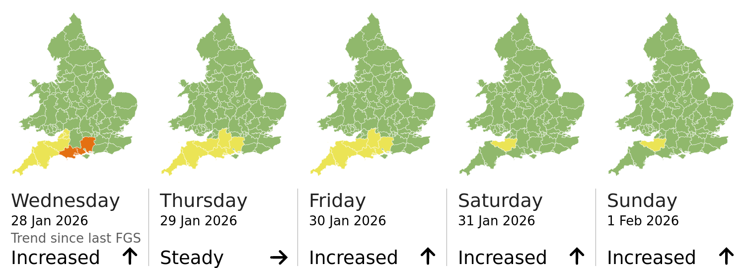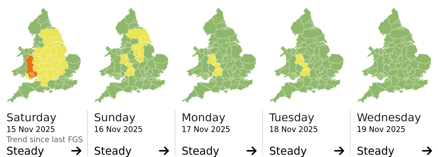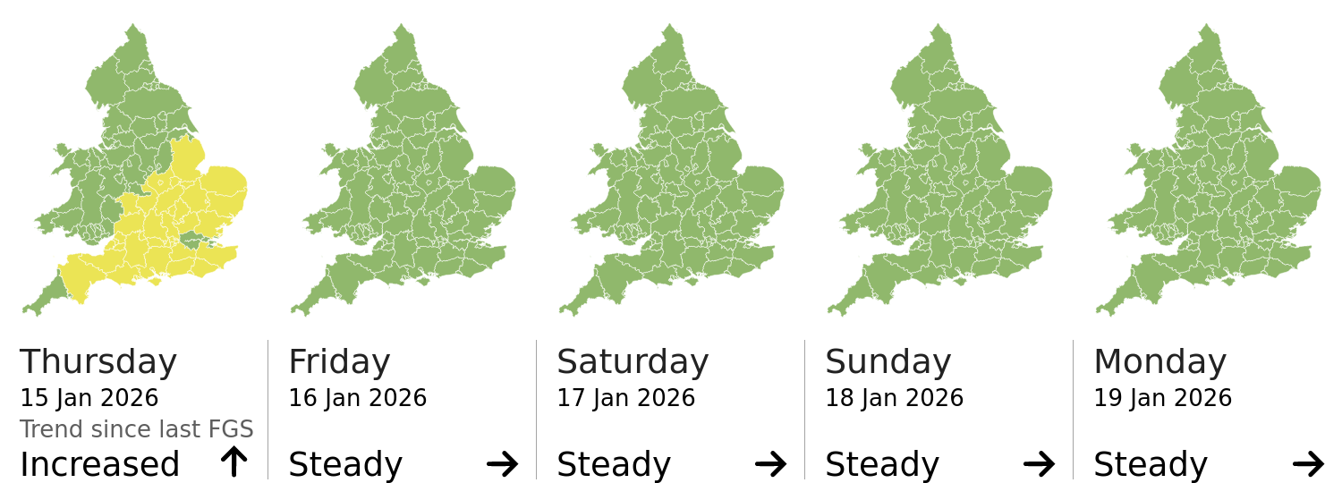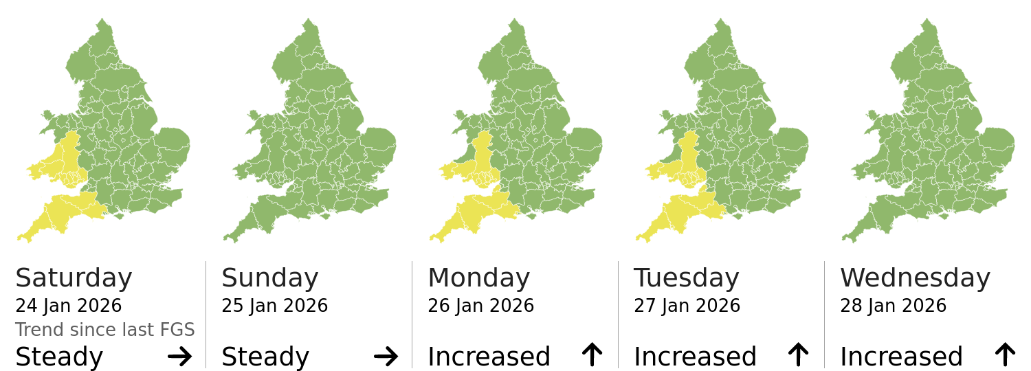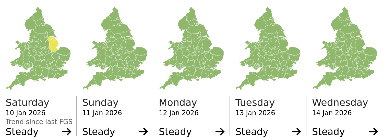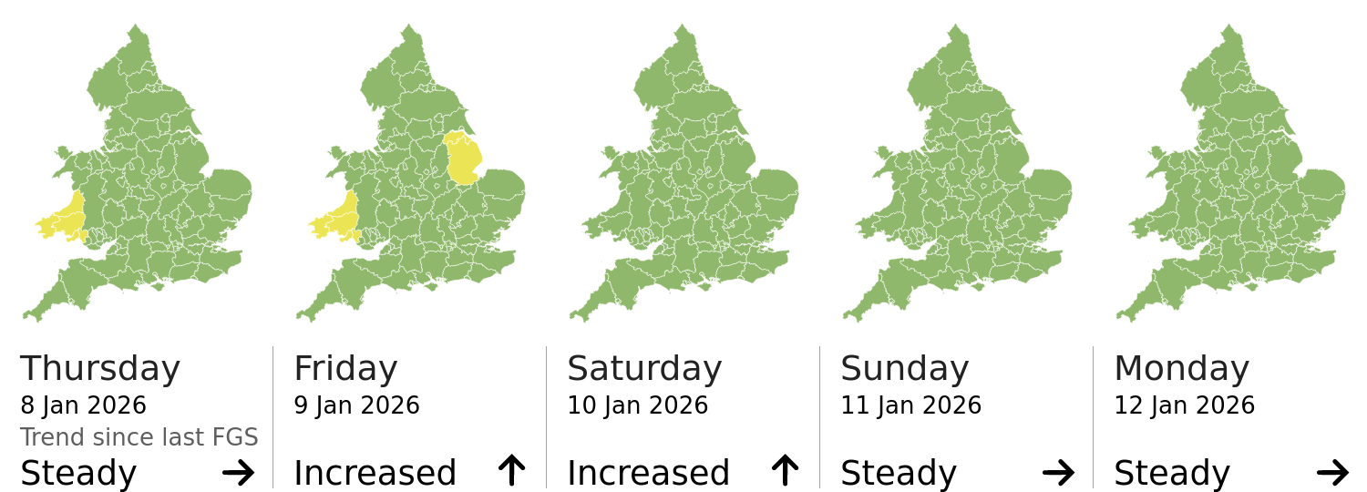 This shows the latest issued Flood Guidance Statement. This is taken from the Environment Agency real-time flood monitoring API, shortly after it is issued by the Flood Forecasting Centre. The highest overall risk is shown, as well as the highest forecast flood impact. This website is not operationally supported. Supported sign up and delivery of the FGS is here.