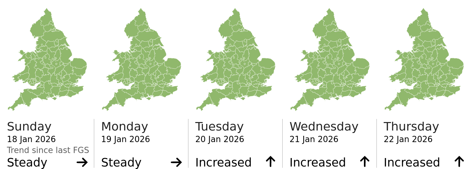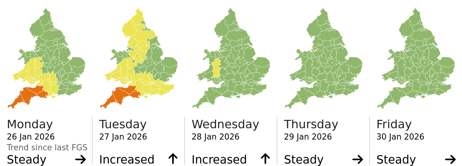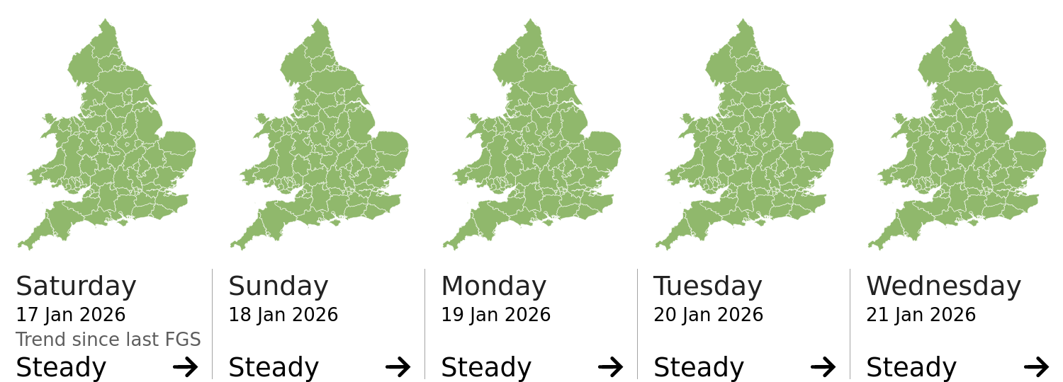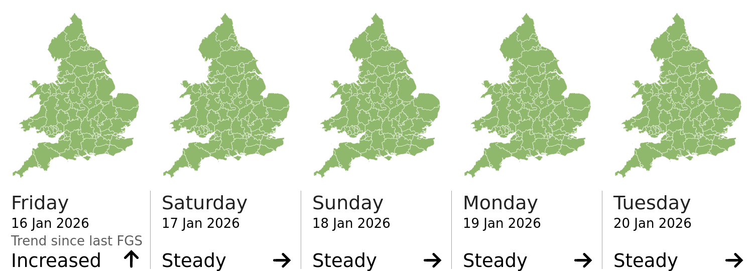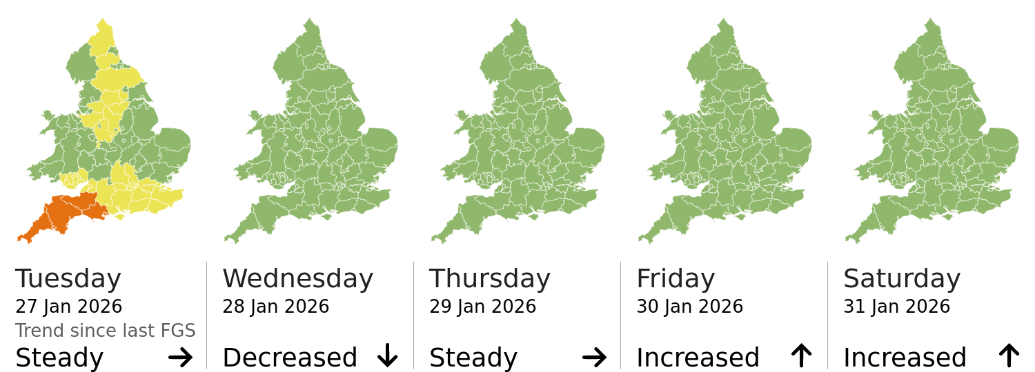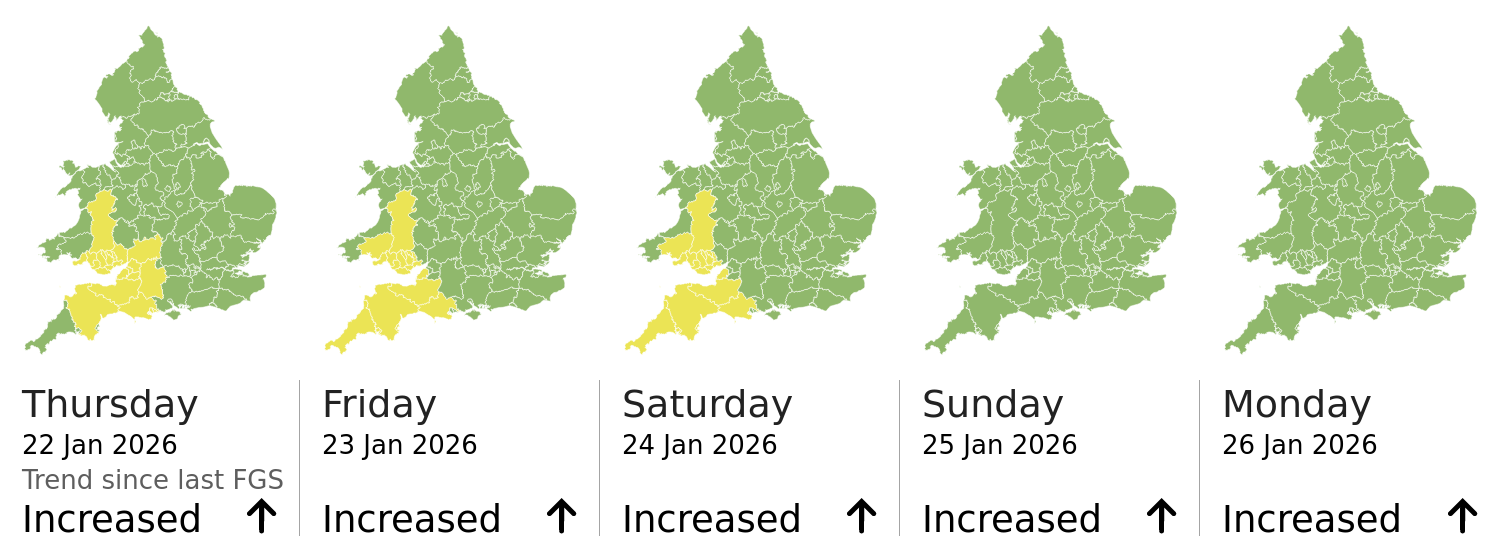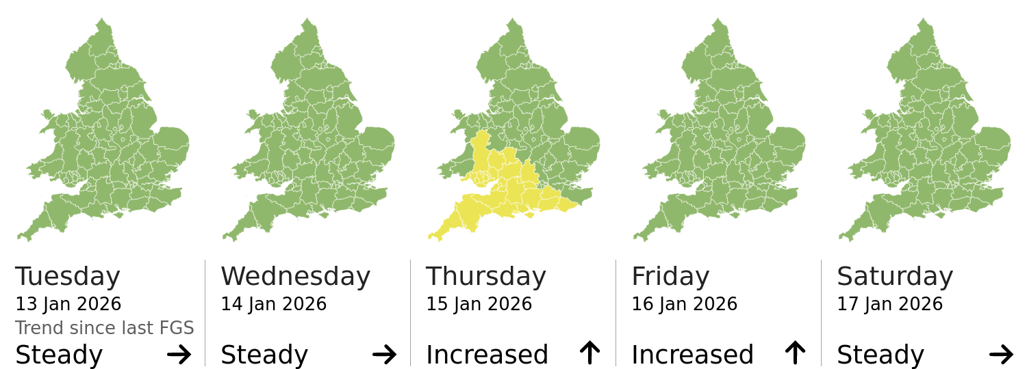 This shows the latest issued Flood Guidance Statement. This is taken from the Environment Agency real-time flood monitoring API, shortly after it is issued by the Flood Forecasting Centre. The highest overall risk is shown, as well as the highest forecast flood impact. This website is not operationally supported. Supported sign up and delivery of the FGS is here.