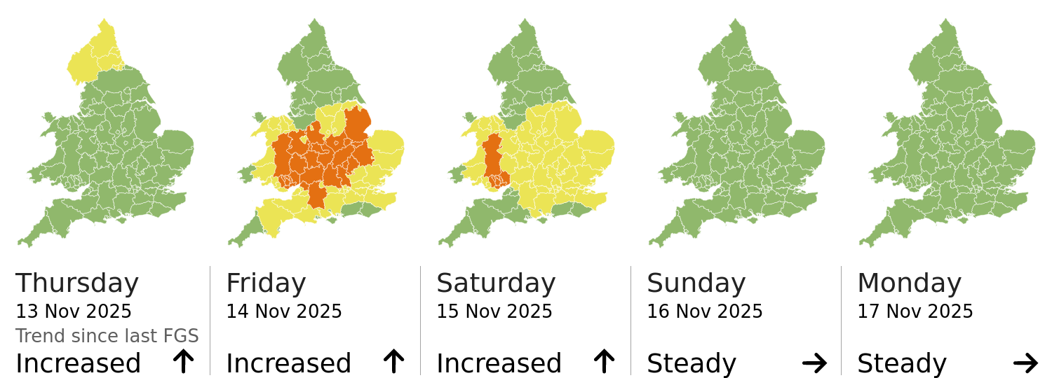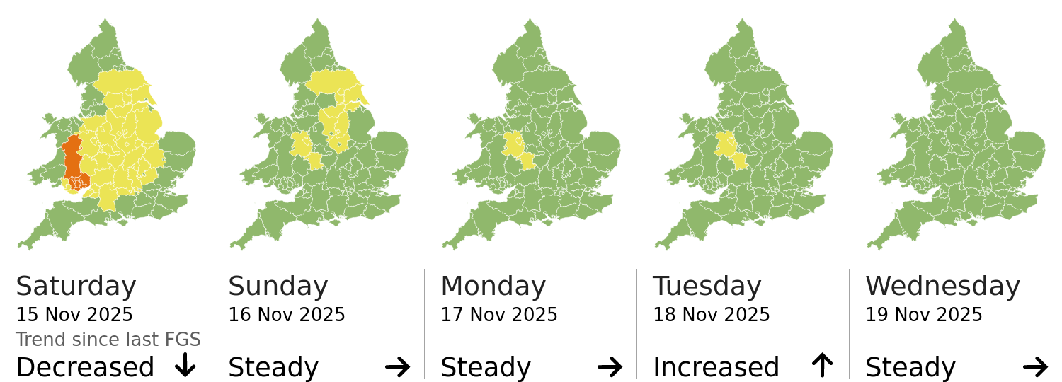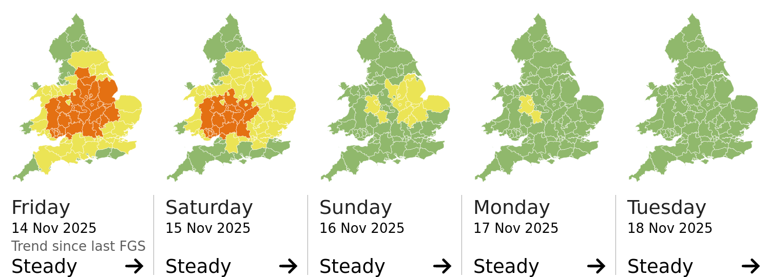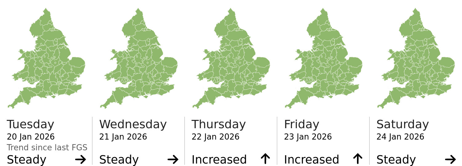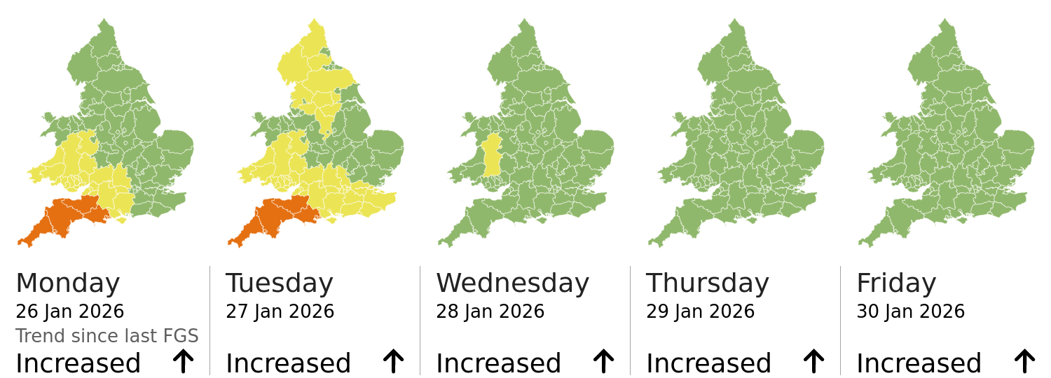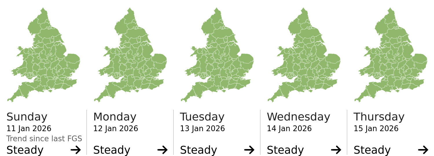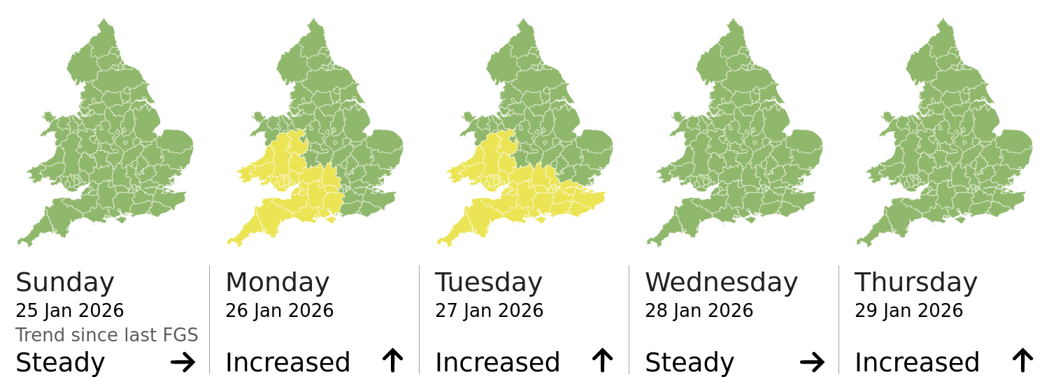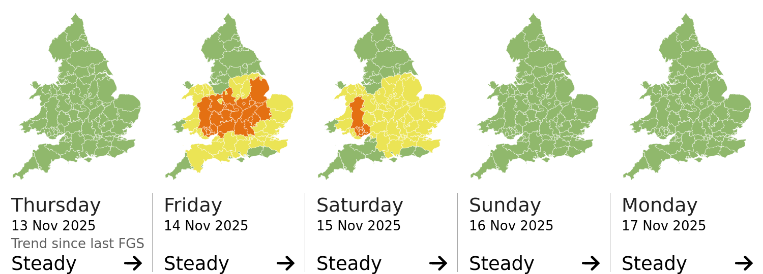 This shows the latest issued Flood Guidance Statement. This is taken from the Environment Agency real-time flood monitoring API, shortly after it is issued by the Flood Forecasting Centre. The highest overall risk is shown, as well as the highest forecast flood impact. This website is not operationally supported. Supported sign up and delivery of the FGS is here.