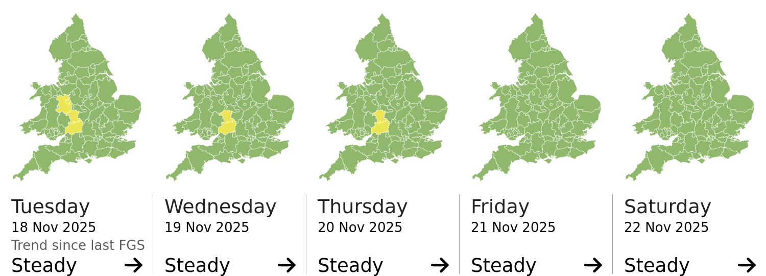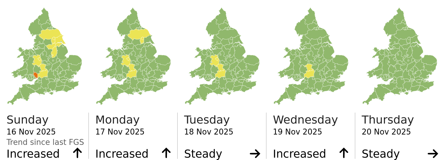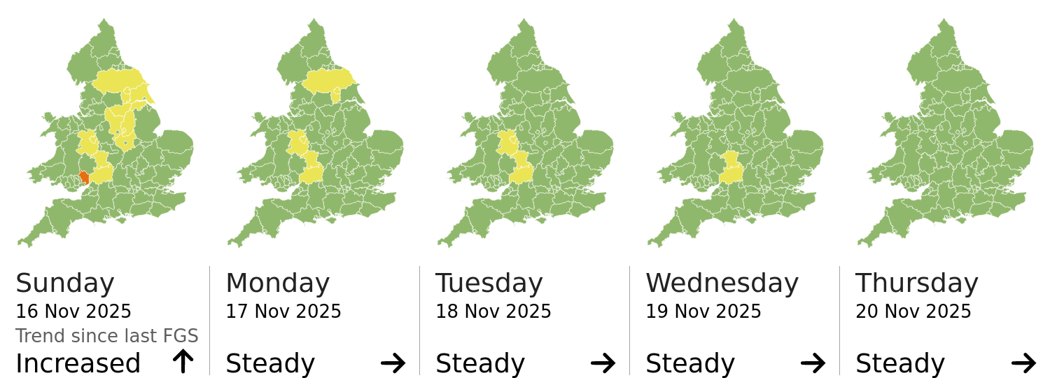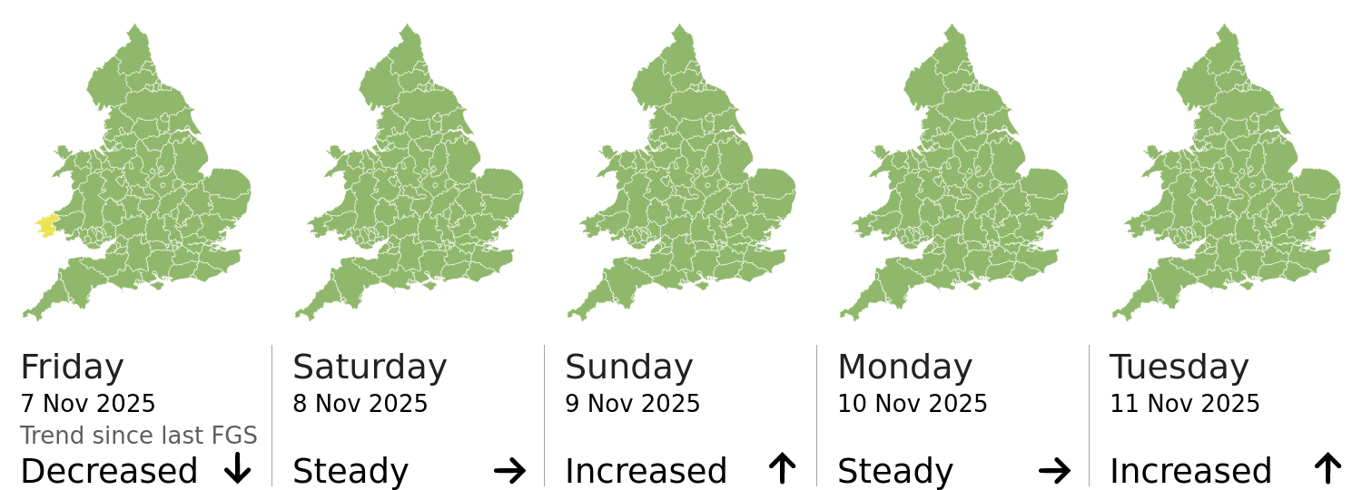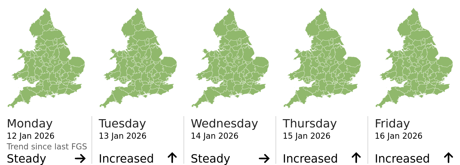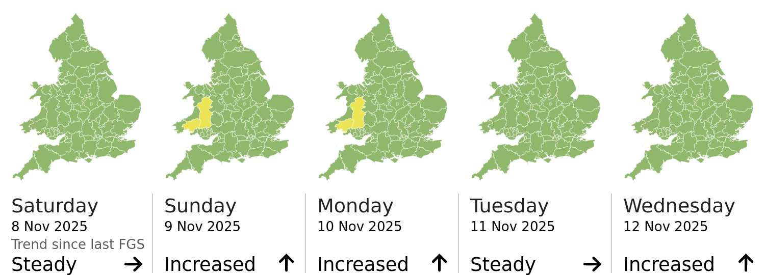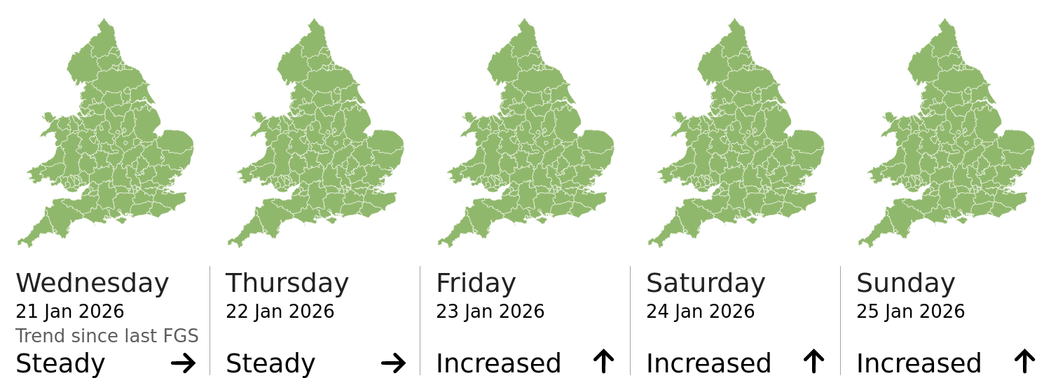 This shows the latest issued Flood Guidance Statement. This is taken from the Environment Agency real-time flood monitoring API, shortly after it is issued by the Flood Forecasting Centre. The highest overall risk is shown, as well as the highest forecast flood impact. This website is not operationally supported. Supported sign up and delivery of the FGS is here.