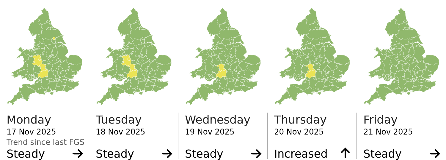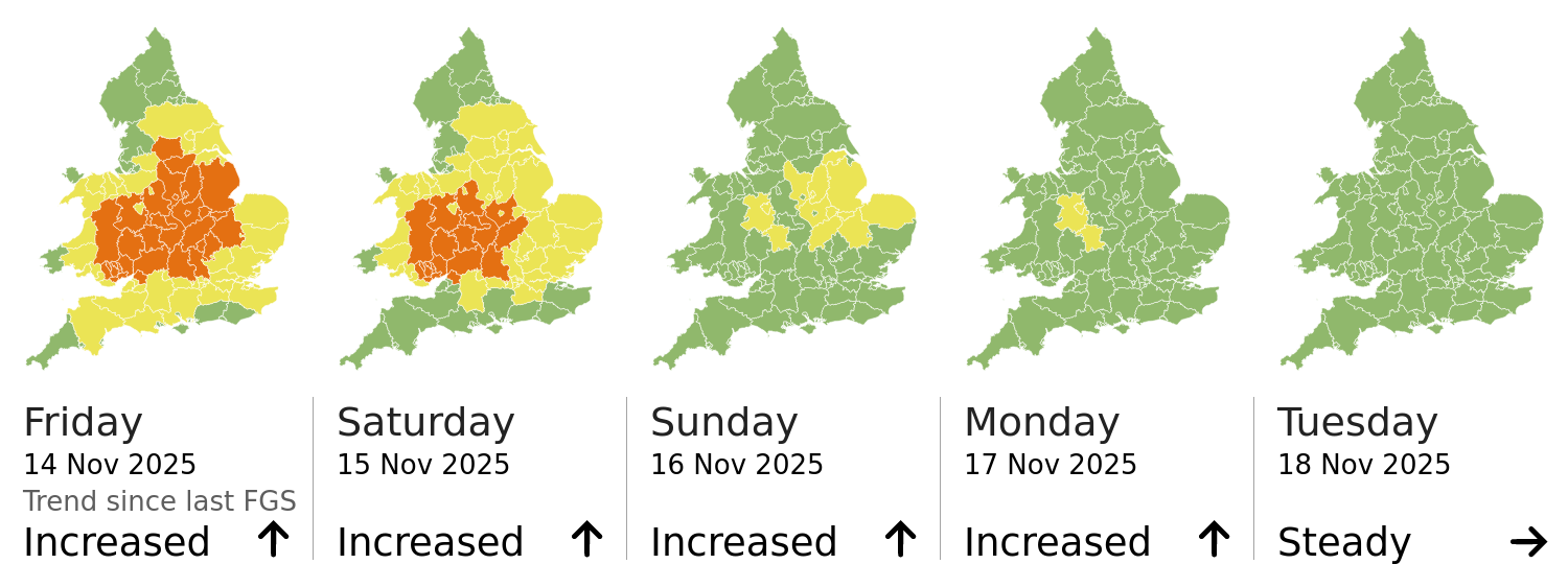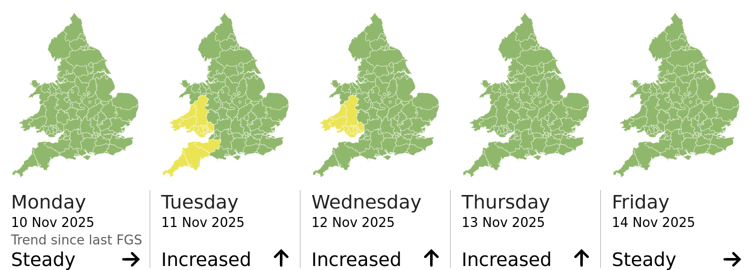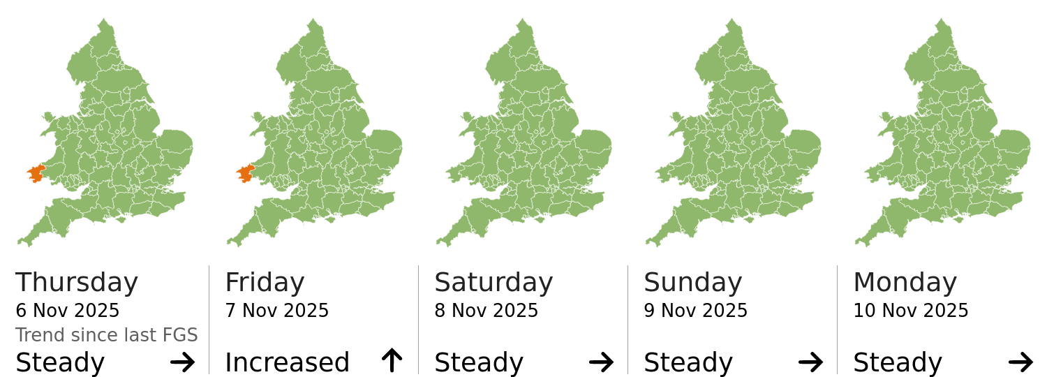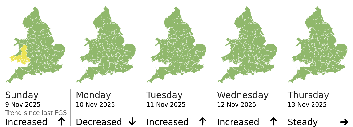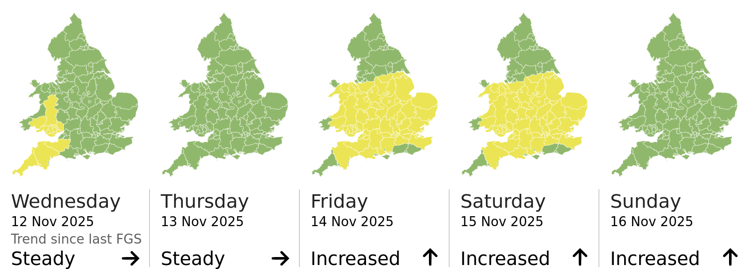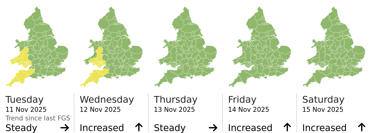 This shows the latest issued Flood Guidance Statement. This is taken from the Environment Agency real-time flood monitoring API, shortly after it is issued by the Flood Forecasting Centre. The highest overall risk is shown, as well as the highest forecast flood impact. This website is not operationally supported. Supported sign up and delivery of the FGS is here.
