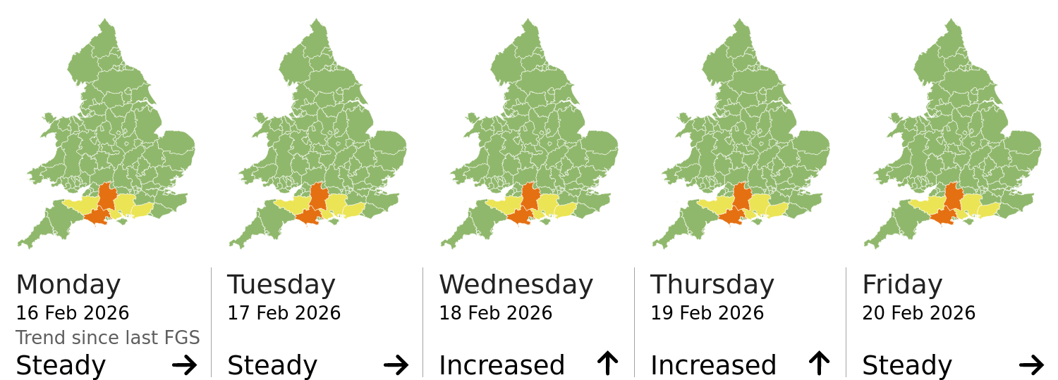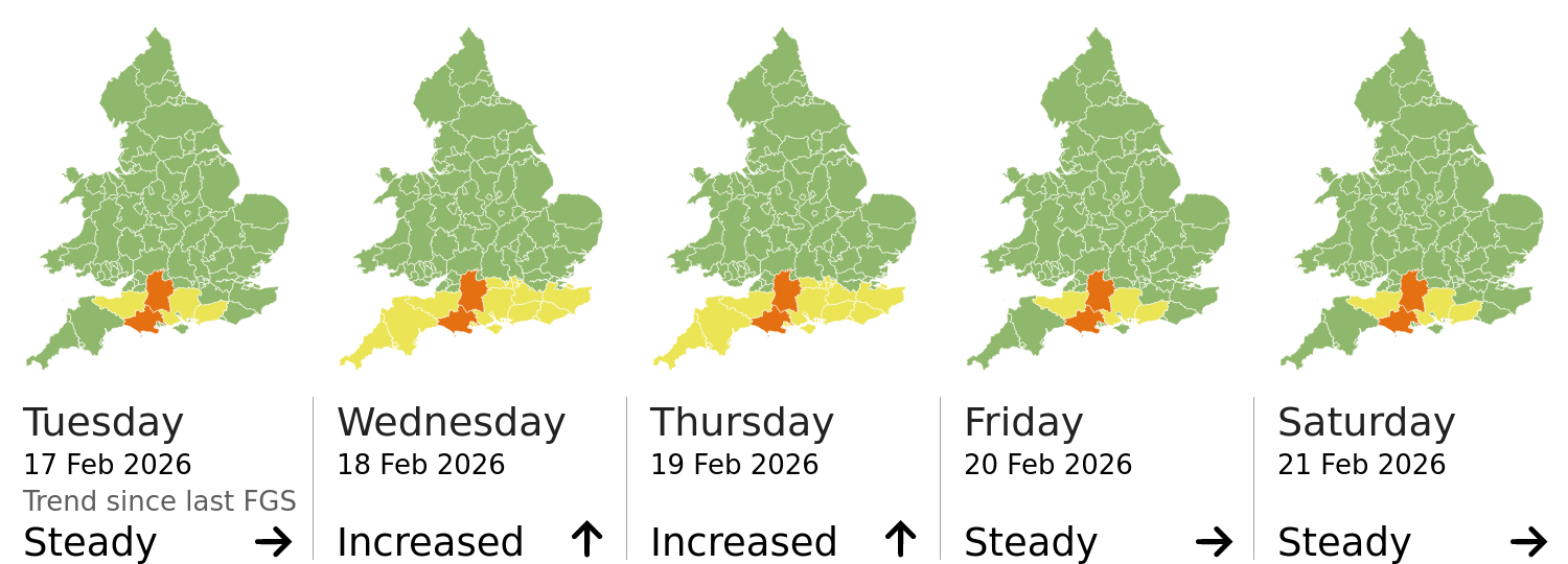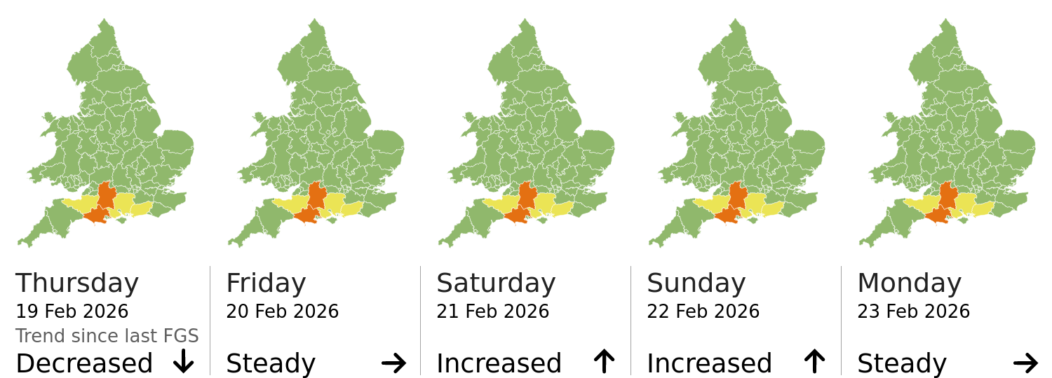 | Groundwater | The groundwater flood risk is MEDIUM for the next five days. Significant groundwater flooding impacts are probable in parts of Dorset and Wiltshire, with minor impacts probable for parts of Hampshire and West Sussex for the next five days. Minor groundwater flooding impacts are also possible elsewhere in parts of England due to high and steadily rising levels. See Specific Areas of Concern Map. |